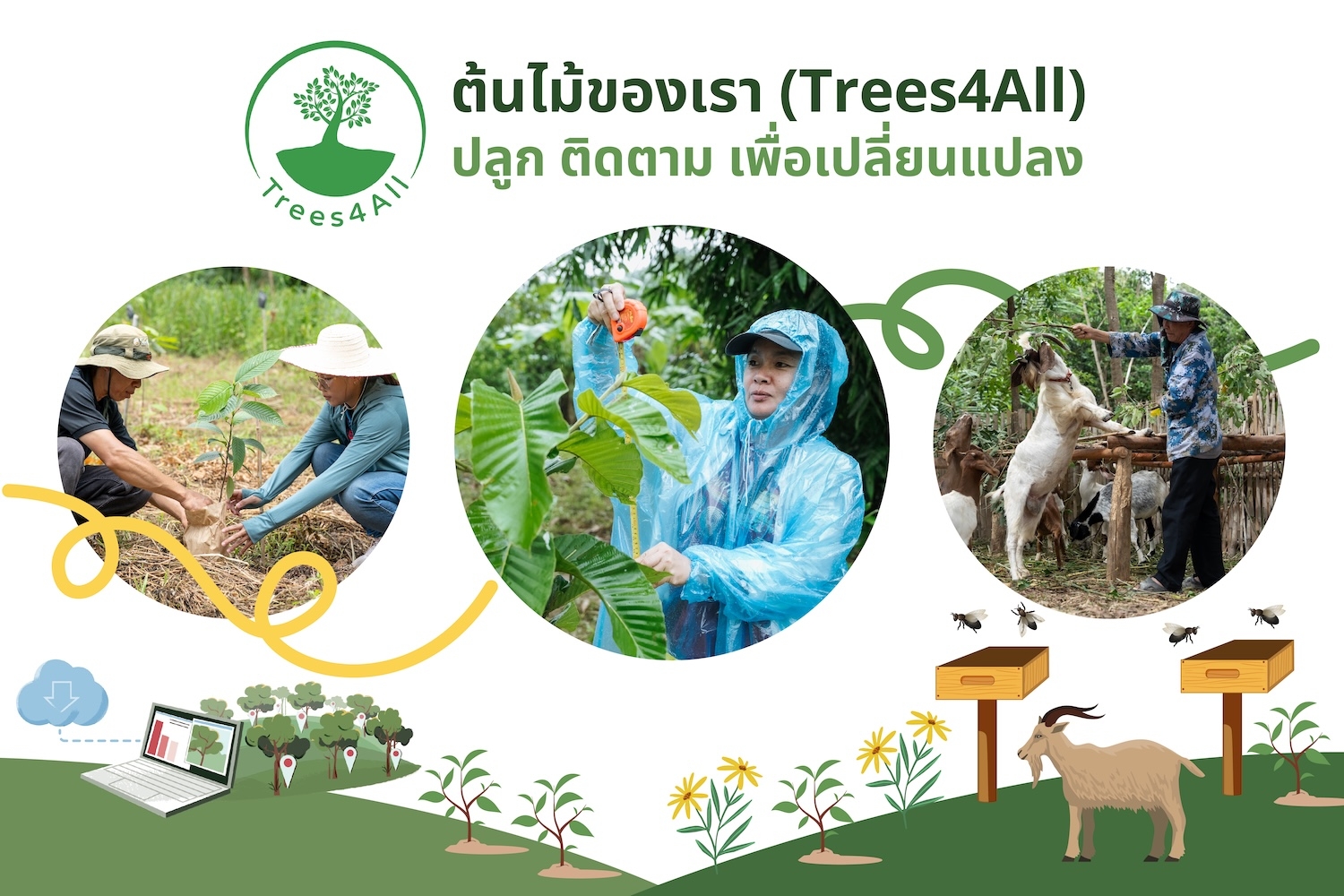 ฟื้นฟูป่าต้นน้ำสู้ภัยธรรมชาติภายใต้สภาวะโลกรวน พร้อมส่งเสริมความเป็นอยู่ที่ยั่งยืนของเกษตรกรน่าน โดยบริจาคเงินปลูกต้นไม้หลากชนิดในราคา 130 บาทต่อ 1 ต้น แล้วร่วมติดตามผลการเติบโตของต้นไม้ผ่านเว็บไซต์ trees4allthailand.org โดยมีเกษตรกรเป็นผู้ดูแลและติดตามต้นไม้ด้วยระบบ GPS เก็บข้อมูลการเติบโต และรายงานผลให้ 3 ปี