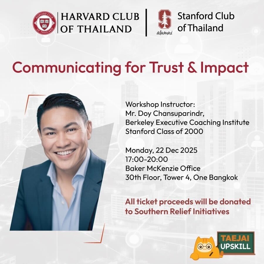 "Communicating for Trust & Impact"with Doy Chansuparindr from Berkeley Executive Coaching Institute, organized by Harvard Club of Thailand and Stanford Club of Thailand, in collaboration with Taejai Upskill and Baker & Mckenzie Thailand. All the ticket proceeds will be donated to Southern Relief Initatives supported by Taejai, with the full donation amount eligible for tax deduction.