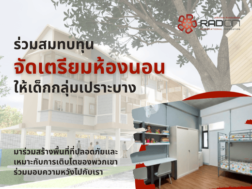 เงินบริจาคของคุณจะนำไปซื้อเตียงนอน ชุดเครื่องนอน ตู้เสื้อผ้า พัดลม รวมถึงโต๊ะอ่านหนังสือทำการบ้าน ให้กับเด็กกลุ่มเปราะบางที่อาศัยอยู่ในมูลนิธิเรดิออน อินเตอร์เนชั่นแนล 32 คน