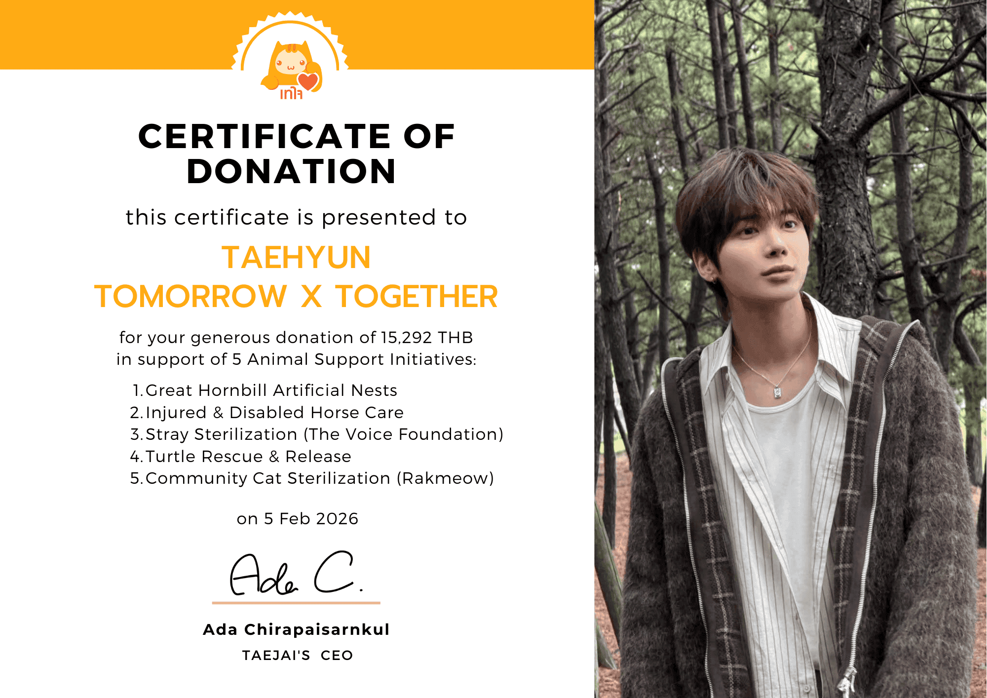 ทุกๆ ยอดบริจาคที่เหล่า MOA ส่งเข้ามา คือการต่อลมหายใจให้นกเงือกในป่า ช่วยให้เต่ากลับลงทะเล หรือทำให้แมวจรมีคุณภาพชีวิตที่ดีขึ้น ในนามของคนที่พวกเขารักที่สุดอย่าง "แทฮยอน"