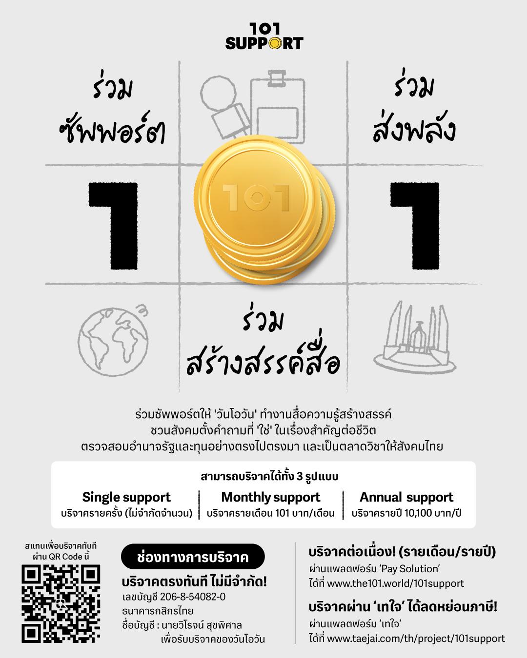 เงินบริจาคของคุณจะเป็นทุนสนับสนุนการทำงานของสื่อความรู้สร้างสรรค์ The101.world ให้กับสื่อที่มุ่งมั่นเชปประเด็นสาธารณะและเปลี่ยนสังคมบนฐานความรู้ มีผู้อ่าน 4,500,000 คนต่อปี